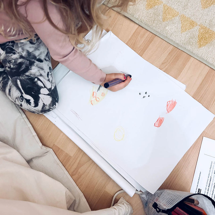 Nur Papier und Stifte – ob Buntstifte, Wasserfarben oder Wachsmalkreiden ist dabei frei wählbar.